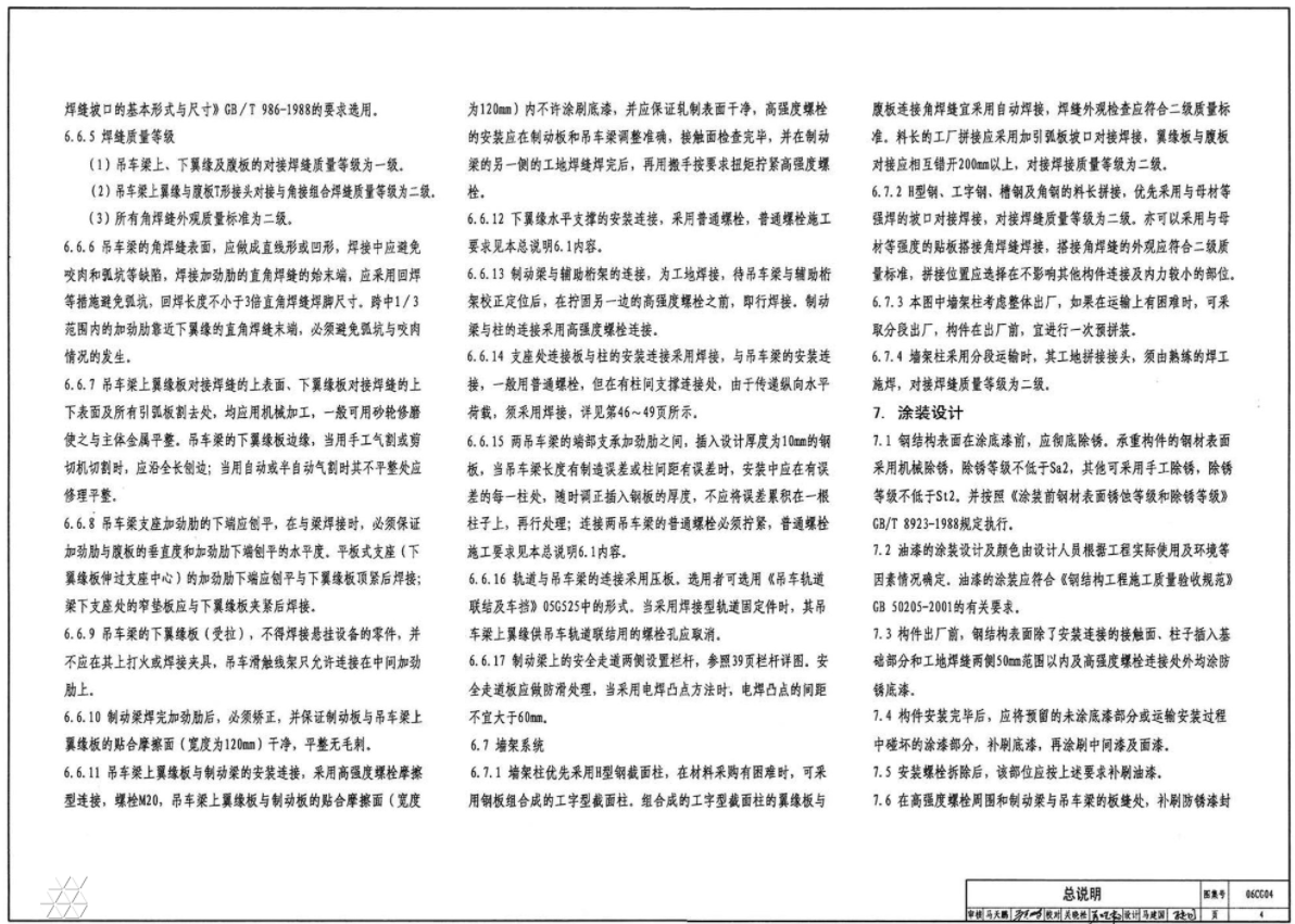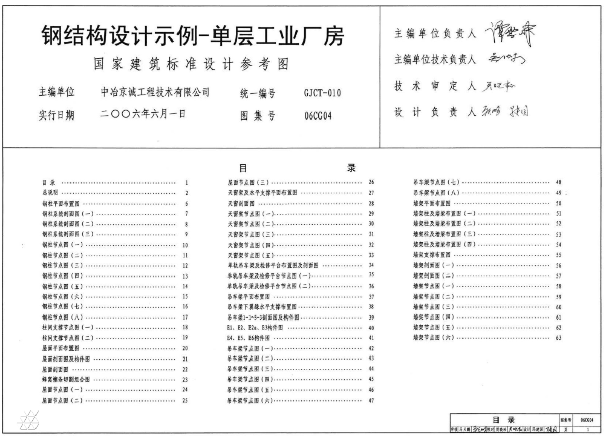 《国家建筑标准设计图集(06CG04):钢结构设计示例-单层工业厂房(国家建筑标准设计参考图)》提供的《钢结构设计示例一单层工业厂房》是冶金行业单层钢结构厂房工程设计示例,其设计制图深度和表示方法均按该行业钢结构设计的习惯做法进行设计,供钢结构工程设计人员参考。