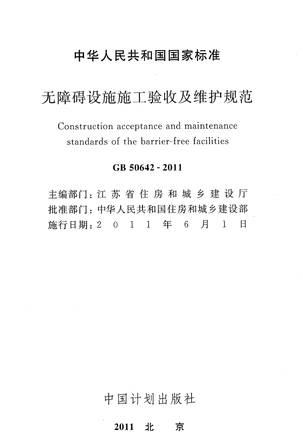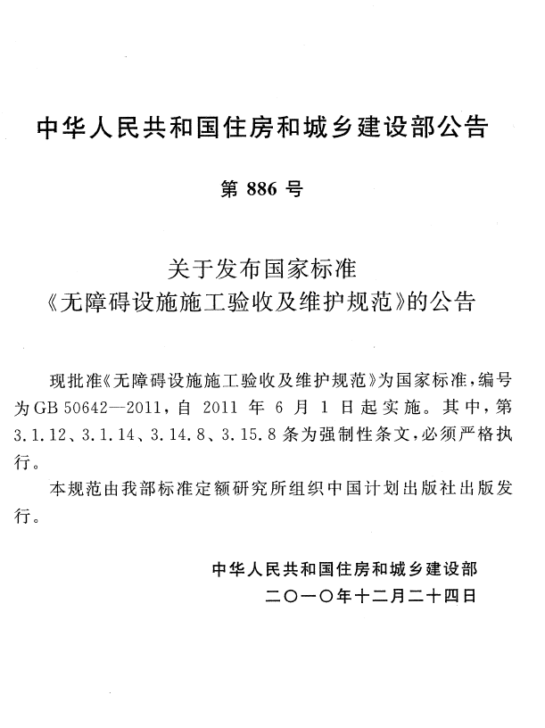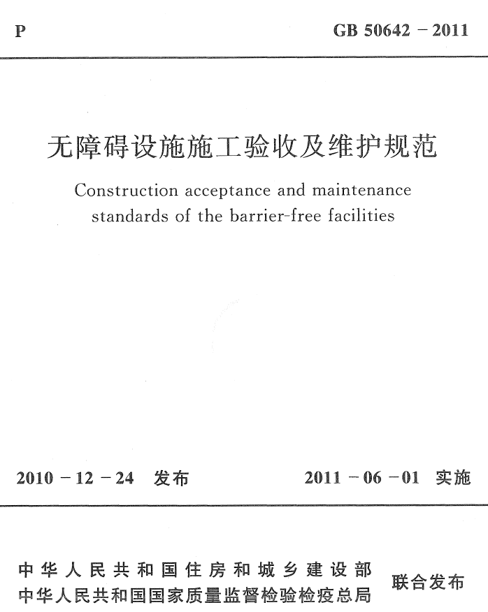 现批准《无障碍设施施工验收及维护规范》为国家标准,编号为GB 50642-2011,自2011年6月1日起实施。其中,第3.1.12、3.1.14、3.14.8、3.15.8条为强制性条文,必须严格执行。