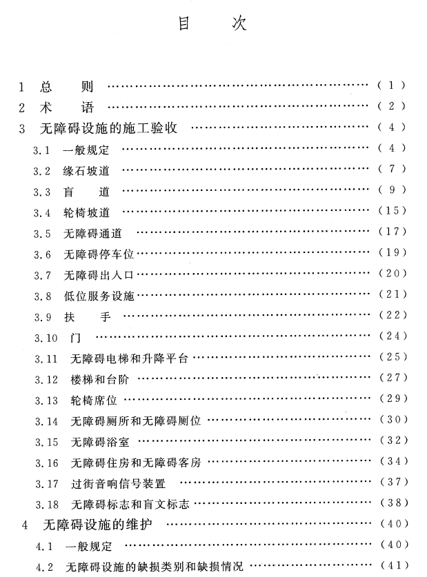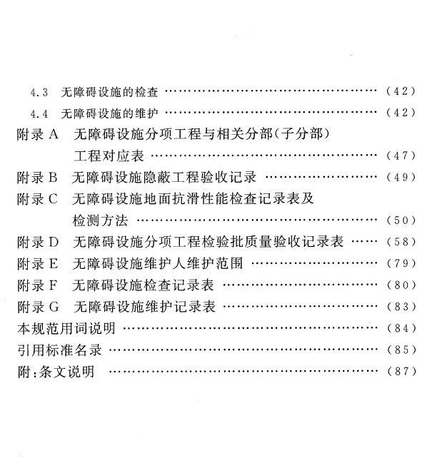 本规范共分4章和7个附录,主要技术内容包括:总则、术语、无障碍设施的施工验收、无障碍设施的堆护。