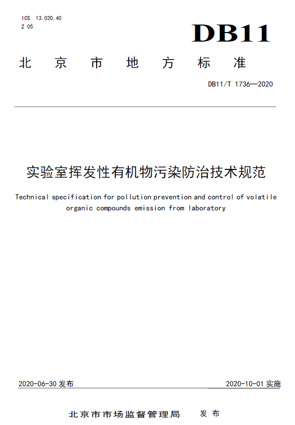 2020年6月30日,经北京市市场监督局批准我市发布《实验室挥发性有机物污染防治技术规范》(DB11/T 1736-2020),标准将于10月1日起实施。